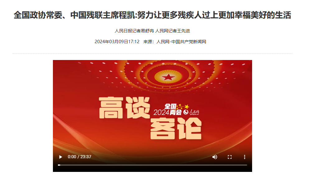 2024年全國兩會(huì)召開之際,全國政協(xié)常委、中國殘聯(lián)主席程凱做客人民網(wǎng),就殘疾人民生保障呈現(xiàn)的新亮點(diǎn)、不斷完善重度殘疾人照護(hù)服務(wù)、給殘疾人創(chuàng)造更多發(fā)展機(jī)會(huì)等內(nèi)容,與網(wǎng)友互動(dòng)交流。