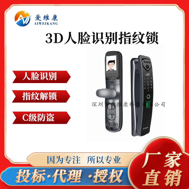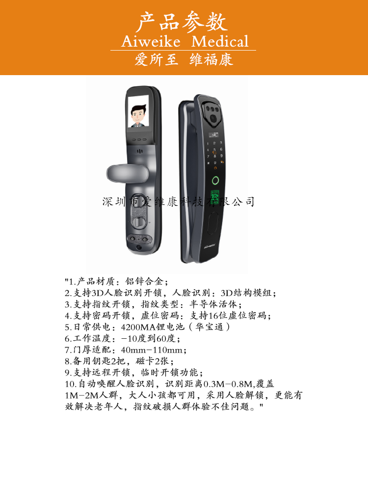 "愛維康指紋開鎖指紋類型:半導(dǎo)體活體 3D人臉識別指紋鎖"